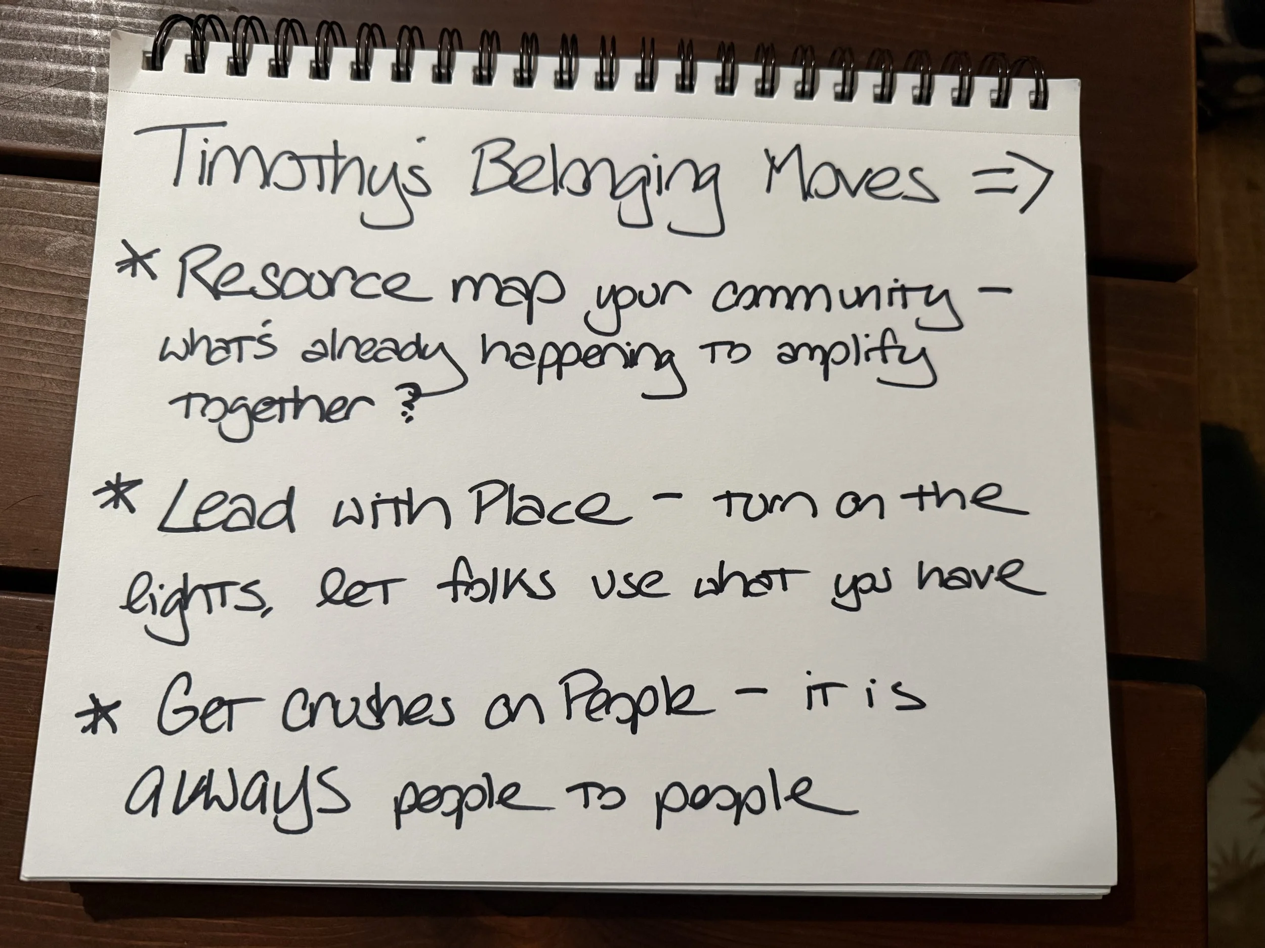 Earn media like it's your marketing budget. Timothy told me after our conversation: "Tell your story such that members of your community would be shattered if you were to go away." A ribbon cutting for a community garden. A mural on the building with local artists. Get the council member there. Get the press. Not to be a cynical marketer — but to bring attention and incentivize people to show up. Because once they show up, they meet each other. And that's when things get going.