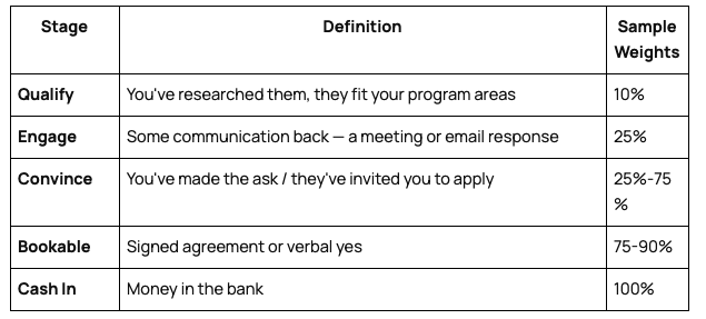 "If you need four donors at $100K, you need at least 40 prospects at “Qualify”. Then you work it down: 30 of those 40 need to get to “Engage”, 15 of those need to get to “Convince” stage, and then 5 to “Bookable” — and hopefully all five convert to “Cash In”."