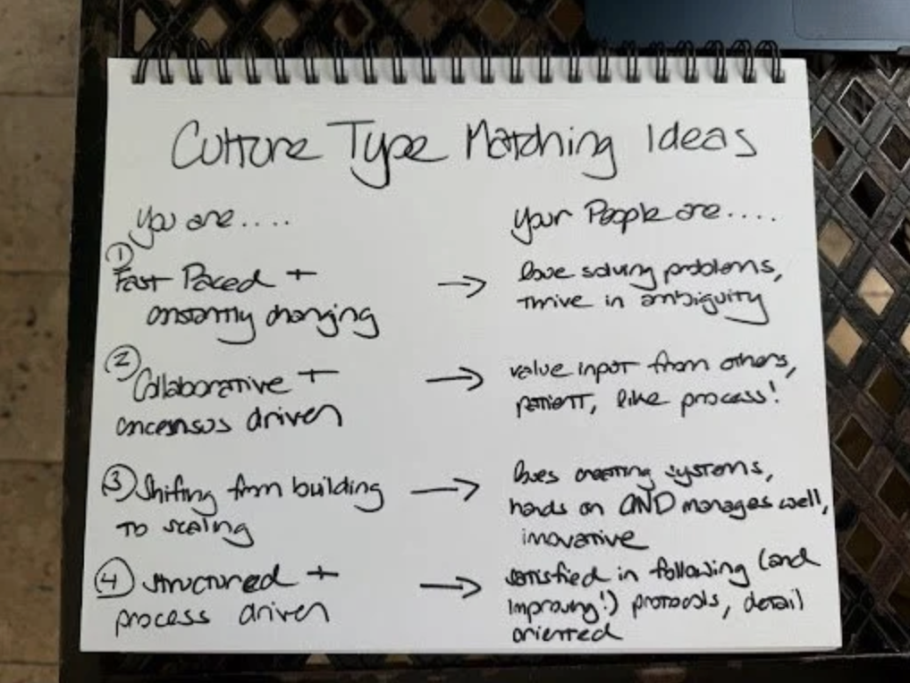 And here's the thing — even within one culture, different roles need different humans. At Rev Foods, we wanted general managers who needed to love chaos and problem-solving. But we also had a nutrition and compliance team — pages and pages of spreadsheets, the most minute detail about every meal, extensive packets submitted monthly for state audits. We needed people who LOVED that structure and detail AND who didn't mind the shifts happening around them. When we couldn't get the apples and needed to replace them with oranges that day, we needed someone who said "okay, got it, let's figure out how to do that" — not "but wait, apples were in the plan, what's happening here?" Same culture. Very different humans within it. So don't be too rigid about this — your culture is rarely all one thing.