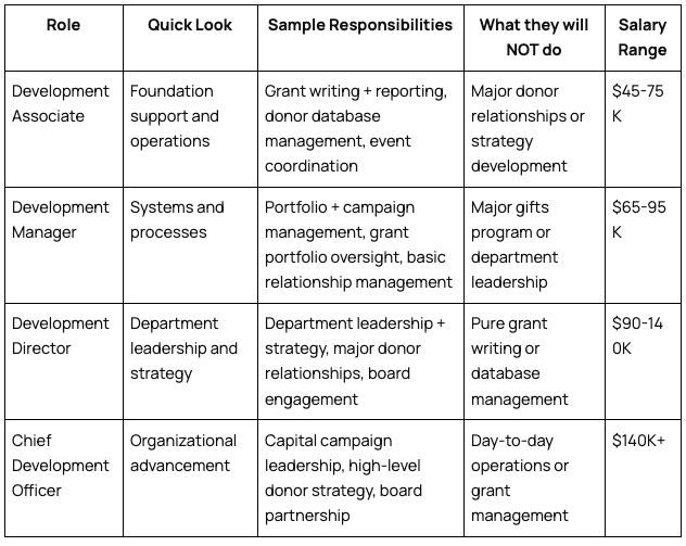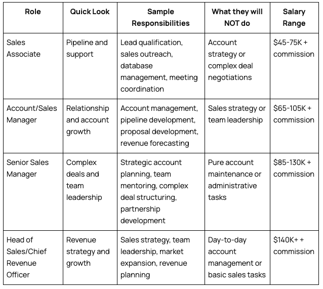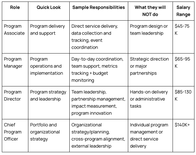 A reference table breaking down common roles across five functions (ops, development, sales, program, product) — with quick descriptions, sample responsibilities, what they WON'T do, and salary ranges.