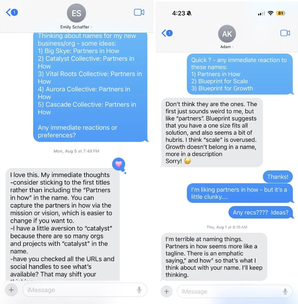 Text message exchanges while trying to figure out the name for Helia - quick feedback at it’s finest!!!